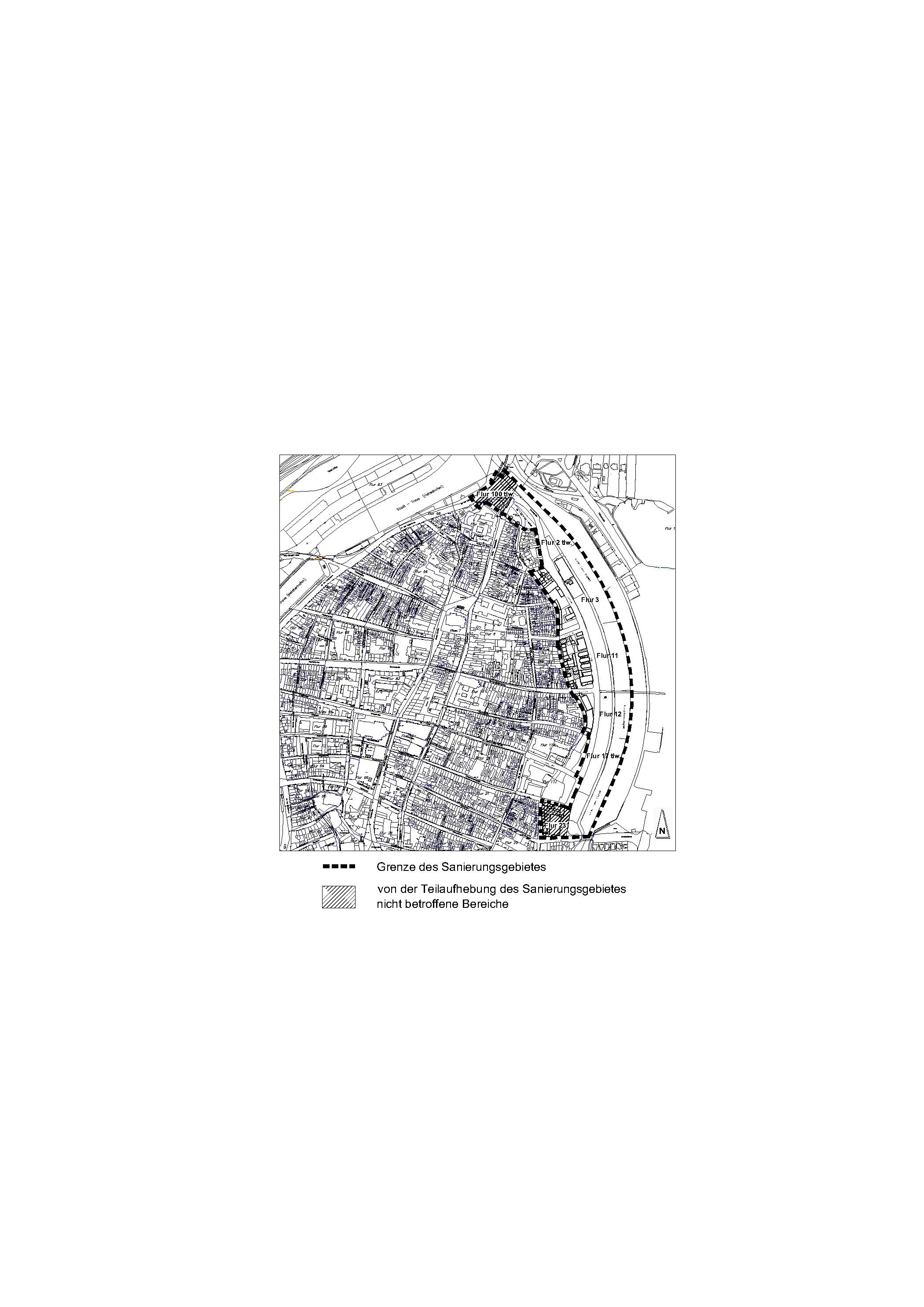 (2) Die Teilaufhebung des Sanierungsgebietes erfolgt in den Grenzen, die in dem als Anlage beigefügten Lageplan dargestellt sind. Dieser Plan ist Bestandteil der Satzung. Der von der Teilaufhebung nicht betroffene Bereich des Sanierungsgebietes ist darin schraffiert gekennzeichnet.