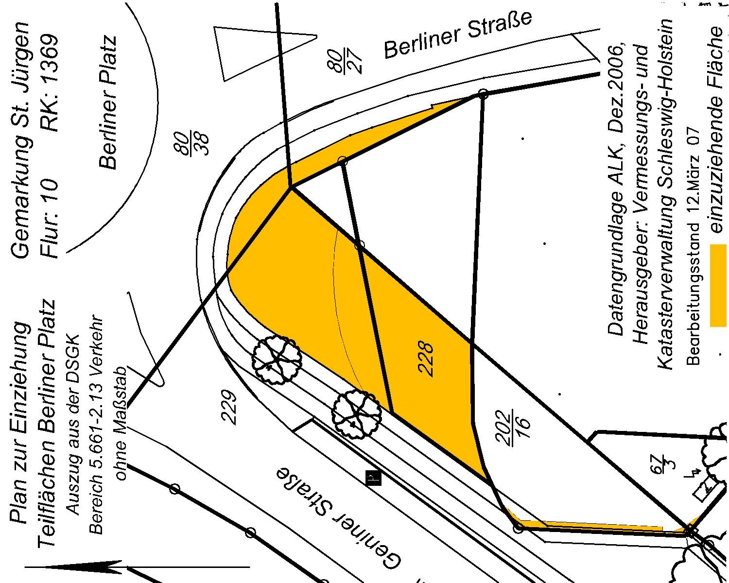 1. Nach § 8 Abs. 1, Satz 2, des Straßen- und Wegegesetzes (StrWG) des Landes Schleswig-Holstein in der Fassung der Bekanntmachung vom 25.11.2003 (GVOBl. Schl.-H. S. 631) wird in der Hansestadt Lübeck folgende öffentliche Verkehrsfläche gemäß Plan eingezogen: · Teilflächen in der Geniner Straße/am Berliner Platz“ - Gemarkung St. Jürgen, Flur 10, Flurstücke 67/3 tlw., 202/16 tlw., 228, 229 tlw., 80/38 tlw. und 80/27 tlw.