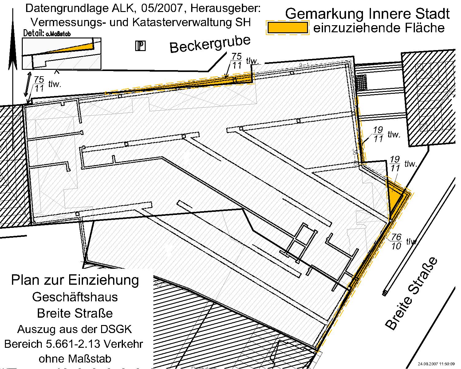 In der Zeit vom 26.09.2007 bis 24.10.2007 hängt der Plan der einzuziehenden Fläche im Fachbereich 5 Planen und Bauen der Hansestadt Lübeck, Mühlendamm 12, im i-Punkt (Foyer/ Erdgeschoss) während der Geschäftszeiten: