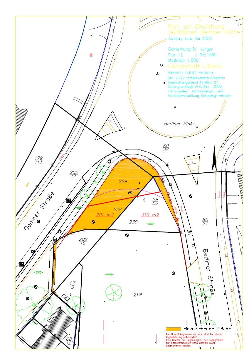 In der Zeit vom 18.07.2007 bis 15.08.2007 hängt der Plan der einzuziehenden Fläche im Fachbereich 5 Planen und Bauen der Hansestadt Lübeck, Mühlendamm 12, im i-Punkt (Foyer/ Erdgeschoss) während der Geschäftszeiten: