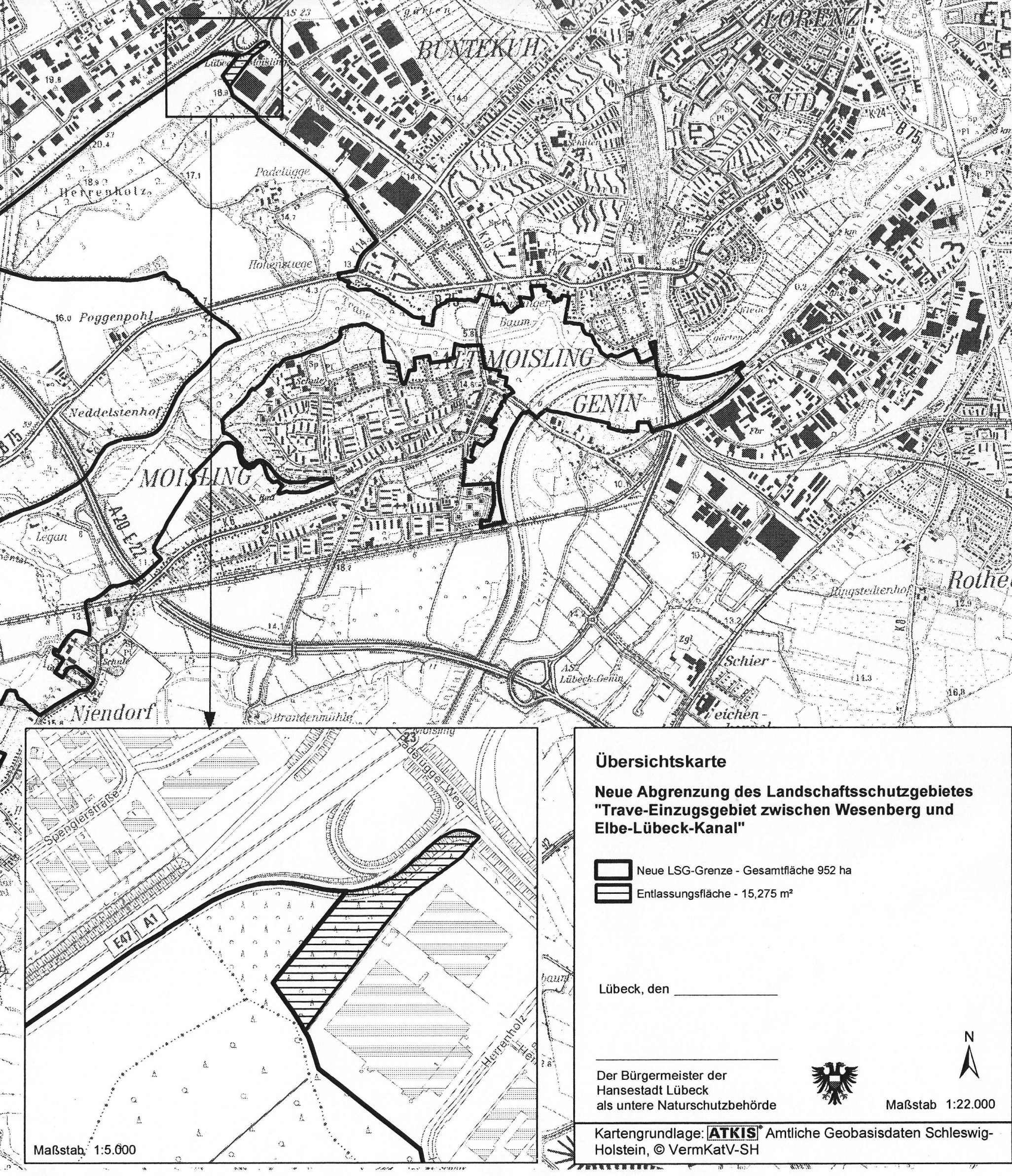 Der Bürgermeister der Hansestadt Lübeck als untere Naturschutzbehörde beabsichtigt, eine Teilfläche von etwa 15.275m² aus dem etwa 972 ha großen Landschaftsschutzgebiet „Trave-Einzugsgebiet zwischen Wesenberg und Elbe Lübeck-Kanal“ im Stadtgebiet der Hansestadt Lübeck vom 17.06.1998 zu entlassen und Aktualisierungen dazu vorzunehmen. Die Entlassungsfläche und der neue Geltungsbereich der Änderungsverordnung ergeben sich aus der als Anlage beigefügten Karte.