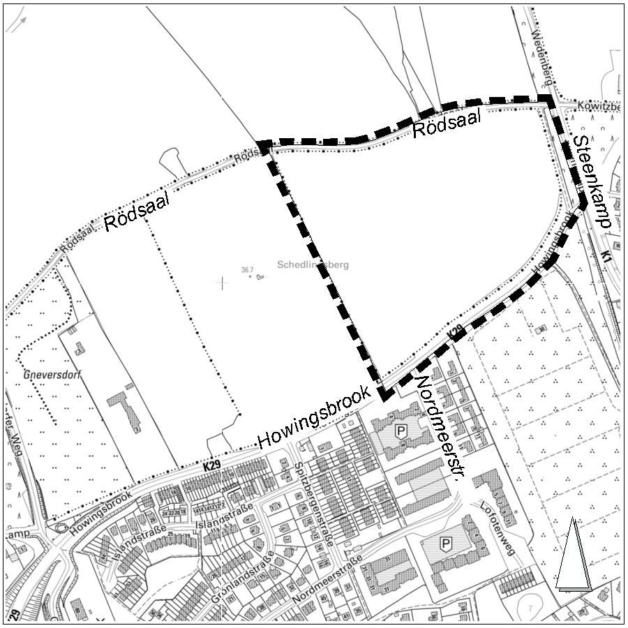 Der Geltungsbereich wird im Süden durch die Straße Howingsbrook, im Osten durch die Straße Steenkamp, im Norden durch die Straße Rödsaal und im Westen durch andere landwirtschaftliche Flächen begrenzt.