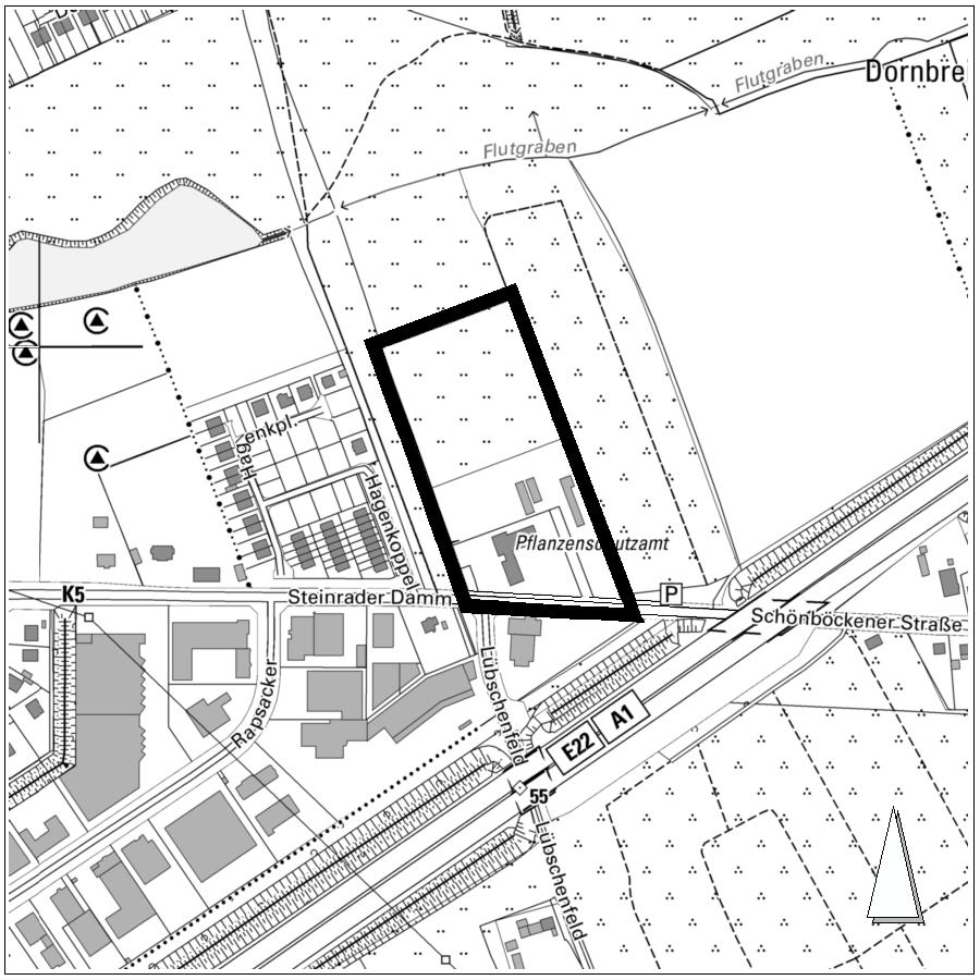 Der Geltungsbereich wird im Norden durch die Flutgrabenniederung, im Osten durch die Kleingartenanlage „Theophil“, im Süden durch die Schönböckener Straße, die im weiteren Verlauf in den Steinrader Damm übergeht, und im Westen durch die Rad- und Fußwegeverbindung auf dem „Alten Bahndamm“ (Fortsetzung Lübschenfeld) und das an den Weg westlich anschließende Wohngebiet Hagenskoppel begrenzt.