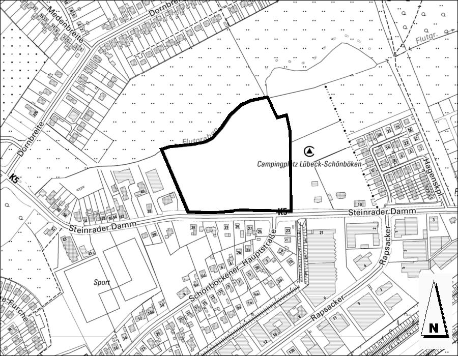 Das Plangebiet des Bebauungsplans 23.27.00 – Steinrader Damm 14 bis 34 – liegt im Stadtteil St. Lorenz Nord, Ortsteil Schönböcken, zwischen dem Steinrader Damm und dem Flutgraben, westlich des dortigen Campingplatzes.