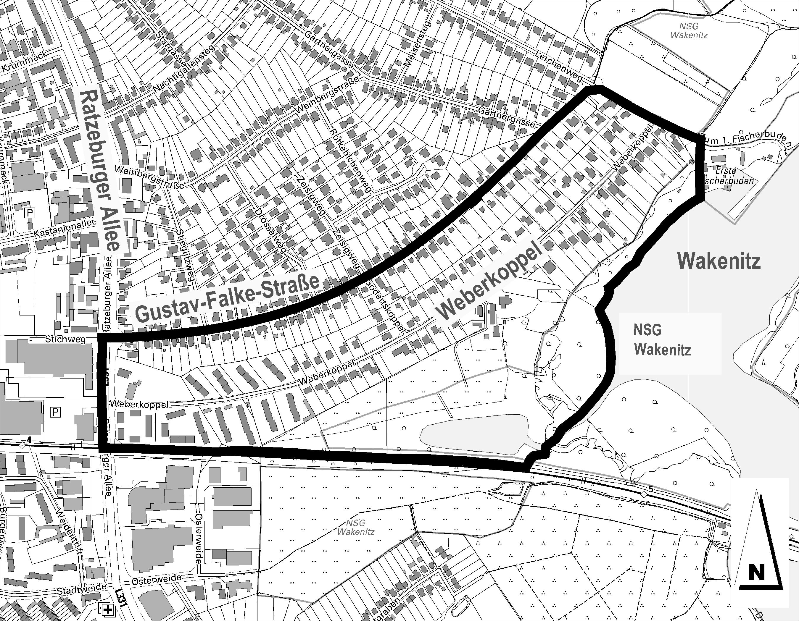 Der Geltungsbereich des aufzustellenden Bebauungsplans umfasst die Grundstücke auf der Südseite der Gustav-Falke-Straße Haus-Nr. 2a bis 86 (gerade), Gödertskoppel 1 bis 4, die auf der Nordseite der Weberkoppel gelegenen Grundstücke der Hausnummern 1 bis 79 (ungerade) und die Grundstücke auf der Südseite der Weberkoppel, die z. T. direkt an die Wakenitz angrenzen, mit den Haus-Nr. 2 bis 80 (gerade) sowie Haus Nr. 1 des Grundstücks in der Straße Zum 1. Fischerbuden.