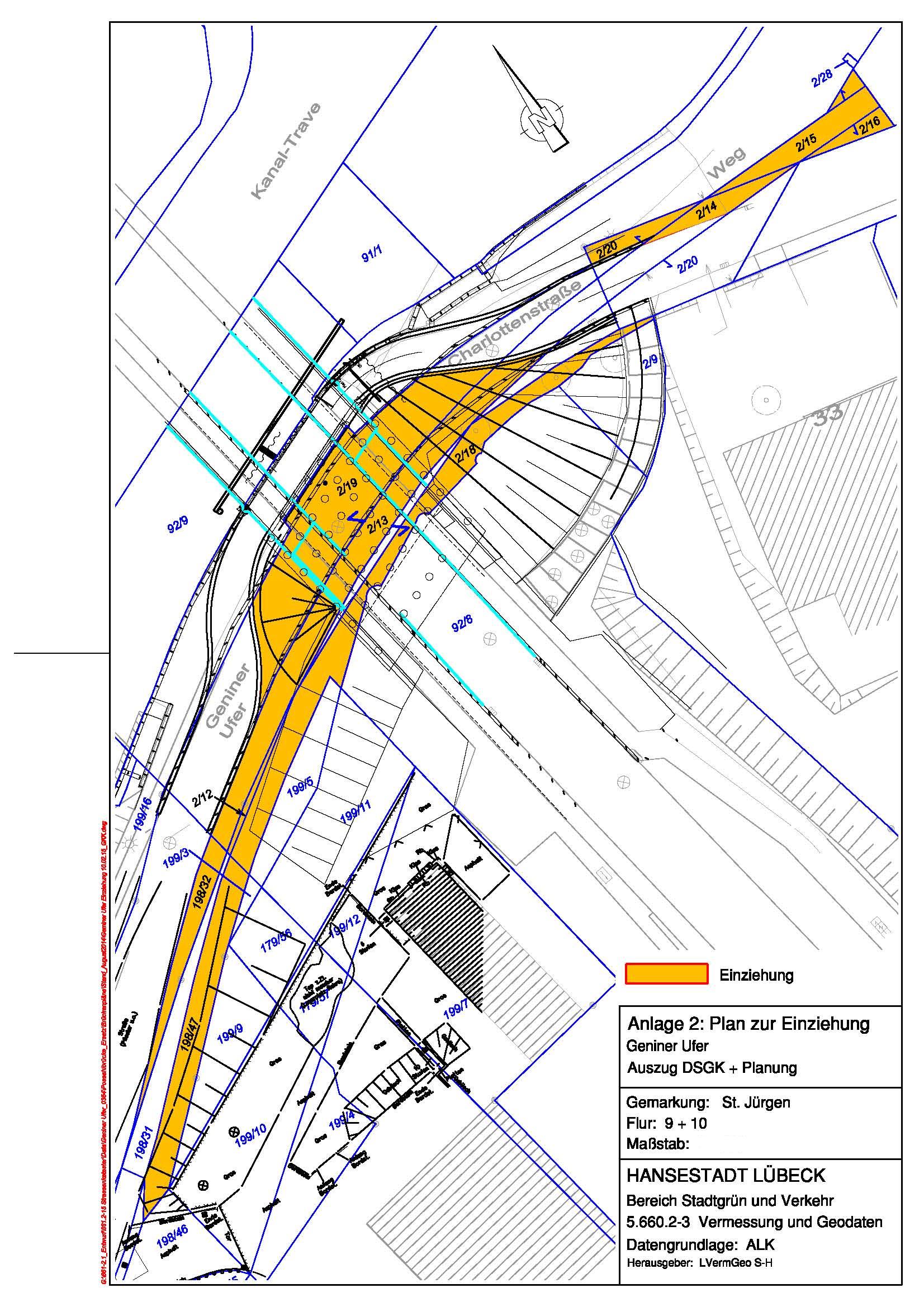 Einziehung eines Teilstücks der Straße Geniner Ufer gemäß Plan unterhalb des Neubaus der Possehlbrücke, betreffend in der Gemarkung St. Jürgen