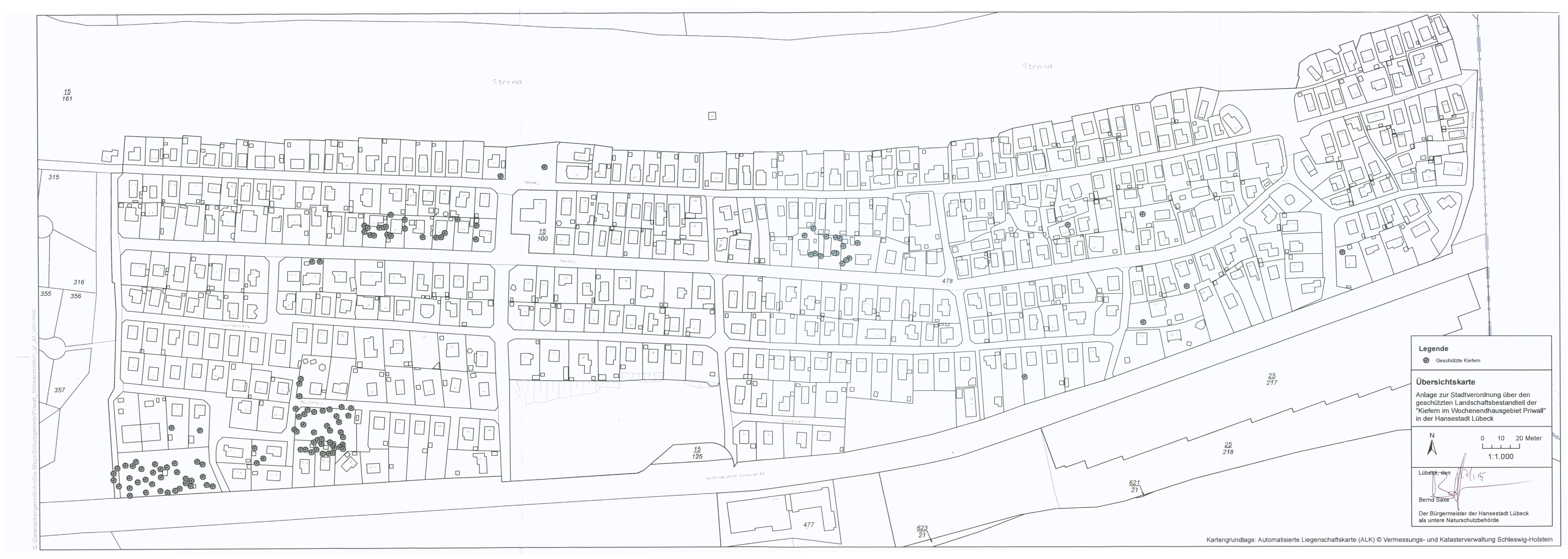 (2) Die geschützten Kiefern sind in der Übersichtskarte im Maßstab 1:1.000 schwarz eingetragen. Die