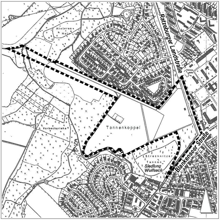 Der räumliche Geltungsbereich der Flächennutzungsplanänderung liegt im Stadtteil St. Jürgen, Gemarkung Strecknitz. Er grenzt im Norden an die Wohnsiedlung am Pallasweg bzw. an der Plutostraße und im Osten an die Ratzeburger Landstraße. Im Süden und Westen wird er durch das Waldgebiet –Strecknitzer Tannen- begrenzt. Das Plangebiet umfasst die Flurstücke 8/299 (tlw.), 16/66 und 16/65 sowie Teilstücke der Ratzeburger Landstraße und des nördlichen Walles, der sich auf dem Flurstück 8/560 befindet.