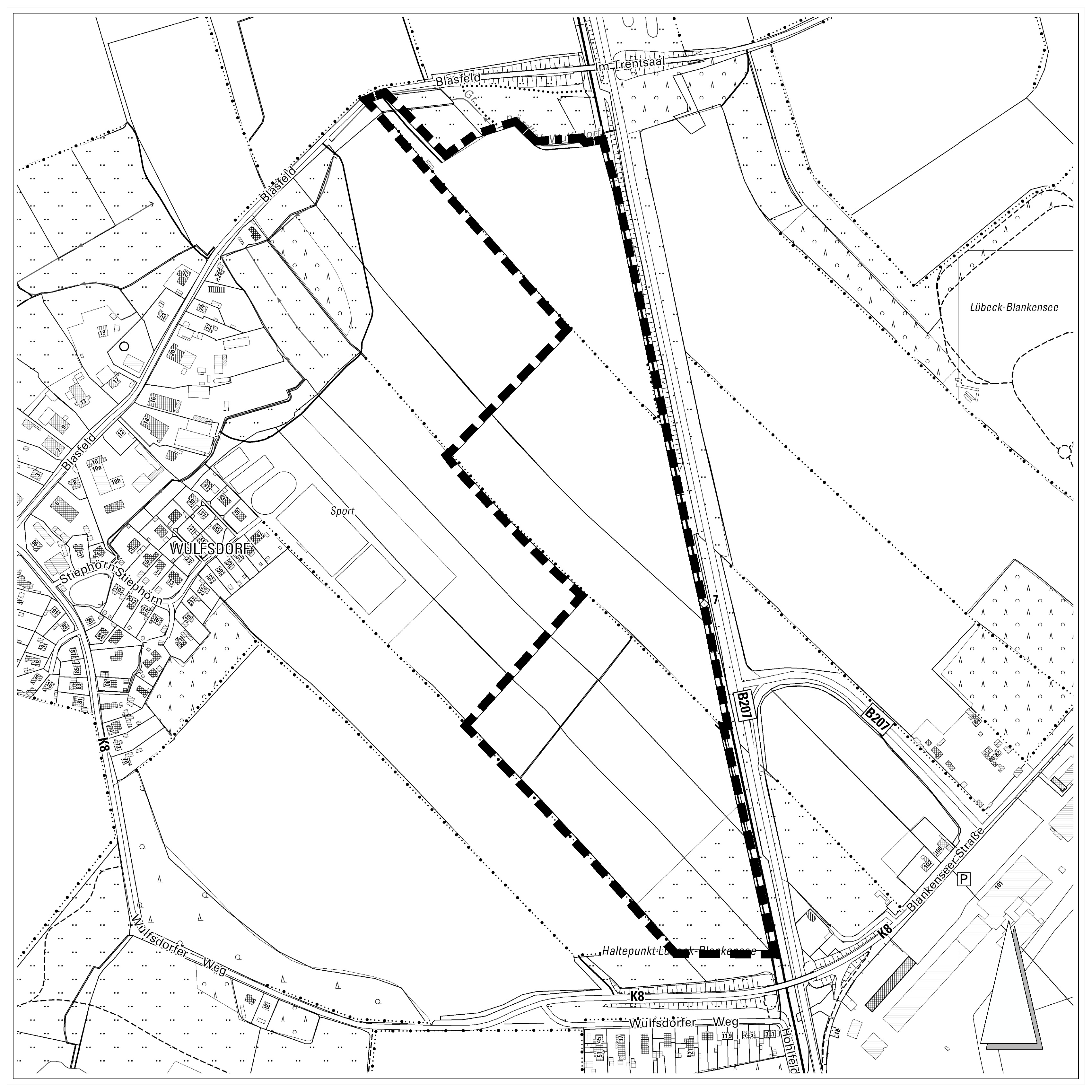 Das Plangebiet wird im Norden durch die Straße Blasfeld, im Osten durch die Bahnstrecke Lübeck - Lüneburg, im Süden durch den Wulfsdorfer Weg und im Westen durch die Ortslage Wulfsdorf begrenzt, die sich jedoch mindestens 200 m entfernt befindet. Zwischen der Orts-lage und dem Geltungsbereich der geplanten Anlage befinden sich landwirtschaftlich genutzte Flächen. An der Westseite ist der Zuschnitt so gewählt, dass weiterhin nutzbare landwirt-schaftliche Flächen verbleiben, die bewirtschaftet werden können.
