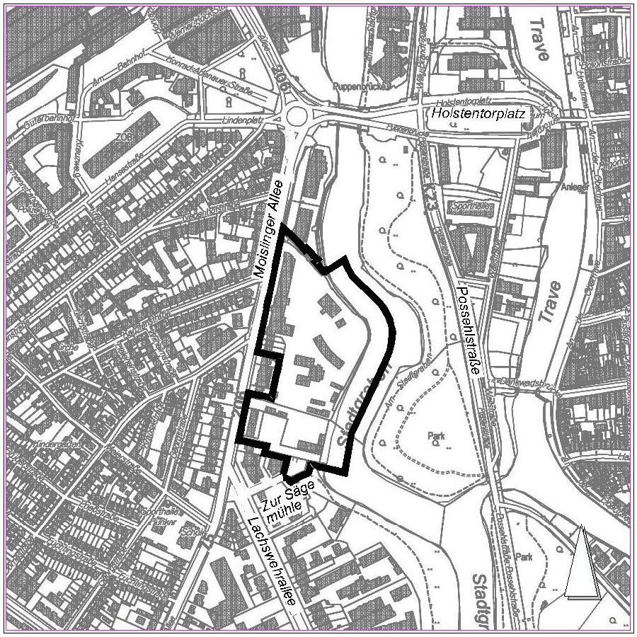 Das Plangebiet des Bebauungsplanes liegt im Stadtteil St. Lorenz Süd, Gemarkung St. Lorenz, Flur 9 und 10 und umfasst im Wesentlichen das Betriebsgrundstück der Stadtwerke Lübeck mit Bürogebäuden, der Kantine, einer Fahrzeugwaschhalle, sowie die Flächen der ca. 250 Stellplätze.