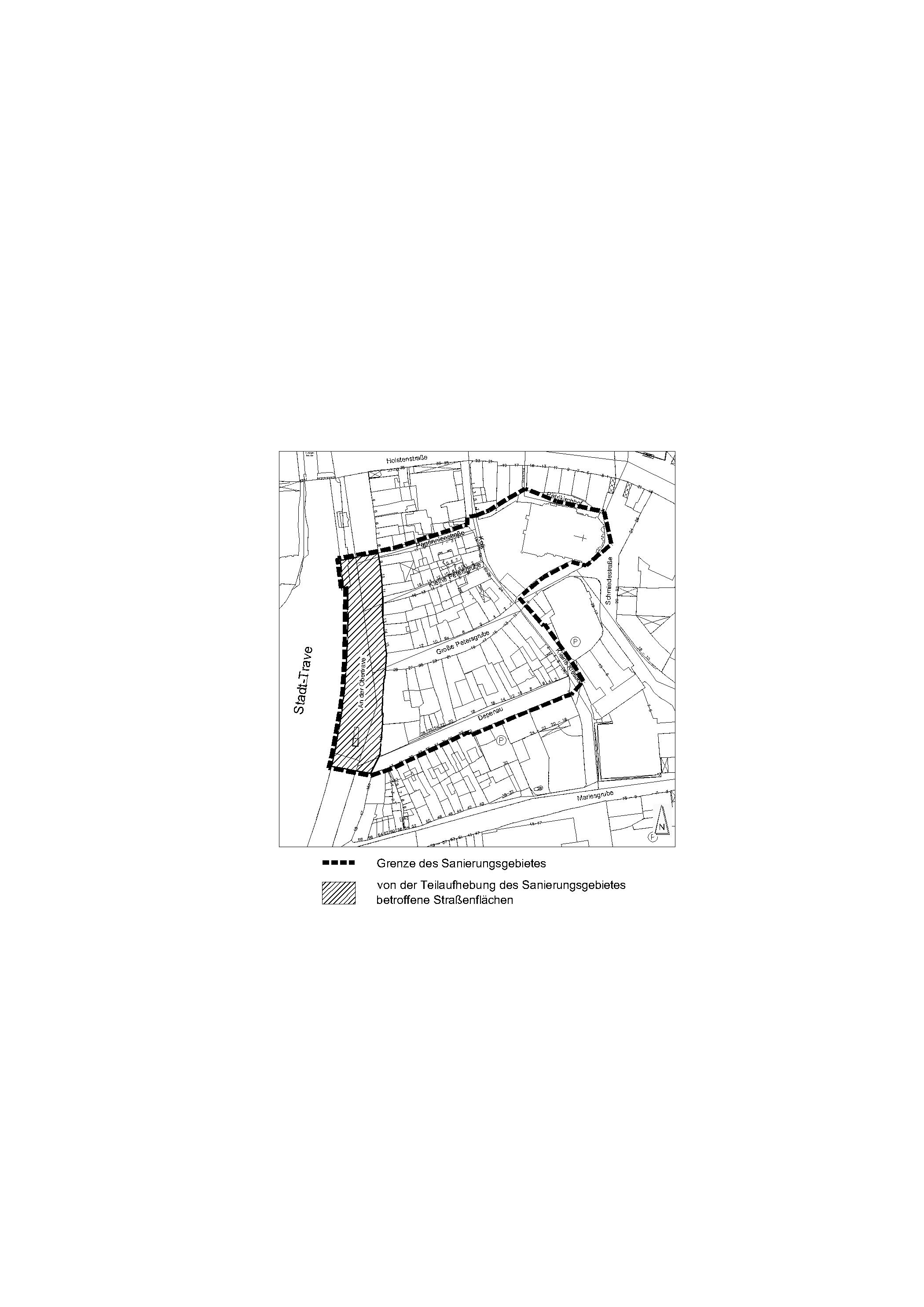 (1) Die Satzung der Hansestadt Lübeck vom 26.07.1972 über die förmliche Festlegung des Sanierungsgebietes „ Petersgrube“, das begrenzt wird im Norden von der Pagönnienstraße und dem Petri-Kirchhof, im Osten von der Schmiedestraße und der Straße „Kleine Kiesau“, im Süden von der Straße „Depenau“ und im Westen von der Straße „An der Obertrave“