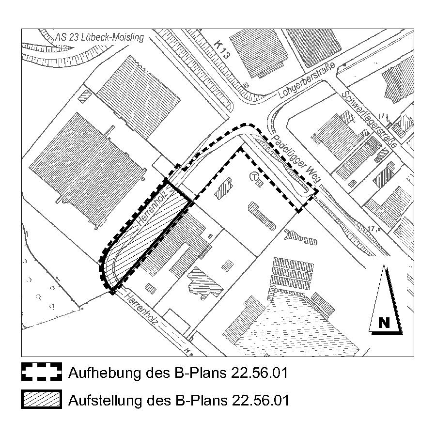 Der Bauausschuss der Hansestadt Lübeck hat in seiner Sitzung am 07.09.2009 beschlossen, dass der Aufstellungsbeschluss für den Bebauungsplan 22.56.01 – Herrenholz Nord – vom 19.11.2007 aufgehoben wird, da die bisherige Planung durch eine neue Planung ersetzt wird. Der Bauausschuss hat für das dargestellte Gebiet die Aufstellung des vorhabenbezogenen Bebauungsplanes 22.56.01 – Herrenholz Nord – mit geänderten Inhalten neu beschlossen.